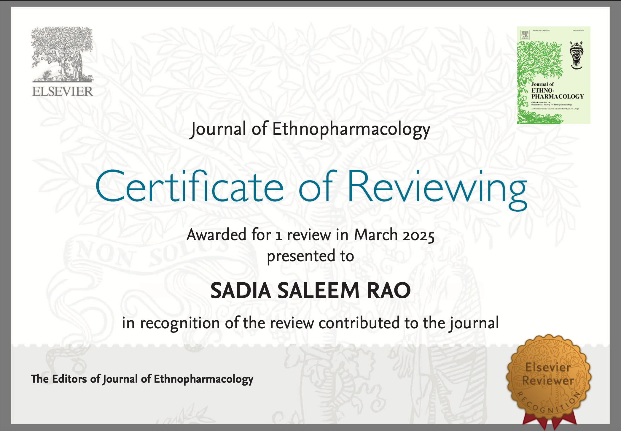 - Invited peer reviewer for journals including Metabolic Brain Disease, Journal of Ethnopharmacology (Elsevier), Saudi Journal of Biological Sciences (Elsevier), Pakistan Journal of Pharmaceutical Sciences